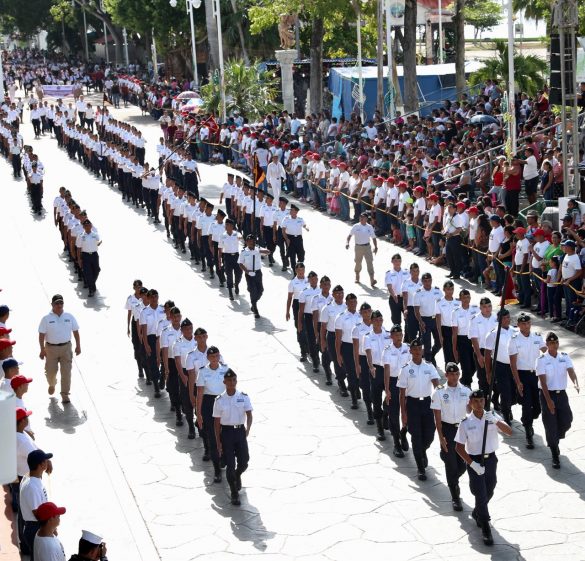 El desfile recorrió la avenida de Los Héroes y pasó frente al Palacio de Gobierno, donde los contingentes fueron saludados por el gobernador Carlos Joaquín, acompañado de su hijo Miguel Joaquín, por representantes de las Fuerzas Armadas y los Poderes Legislativo y Judicial, funcionarios del gabinete e invitados especiales.