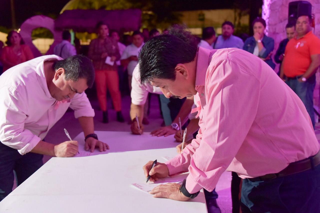 Después del encendido de luces, el presidente, así como funcionarios municipales e invitados especiales, escribieron mensajes a las mujeres para que tomen acciones preventivas contra el cáncer de mama, que colocaron en el corazón emblemático de color rosa que se instaló en el Parque Museo de la Cultura Maya.
