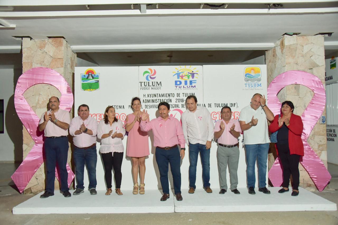 TULUM.-Con el propósito de impulsar acciones de prevención del cáncer de mama entre las mujeres de Tulum, el Ayuntamiento realizó la ceremonia del encendido de luces del Palacio Municipal y el Parque Museo de la Cultura Maya, con el cual se inician las actividades del Mes Rosa, en el cual la Dirección de Salud realizará estudios y pruebas para detectar este padecimiento en forma temprana.