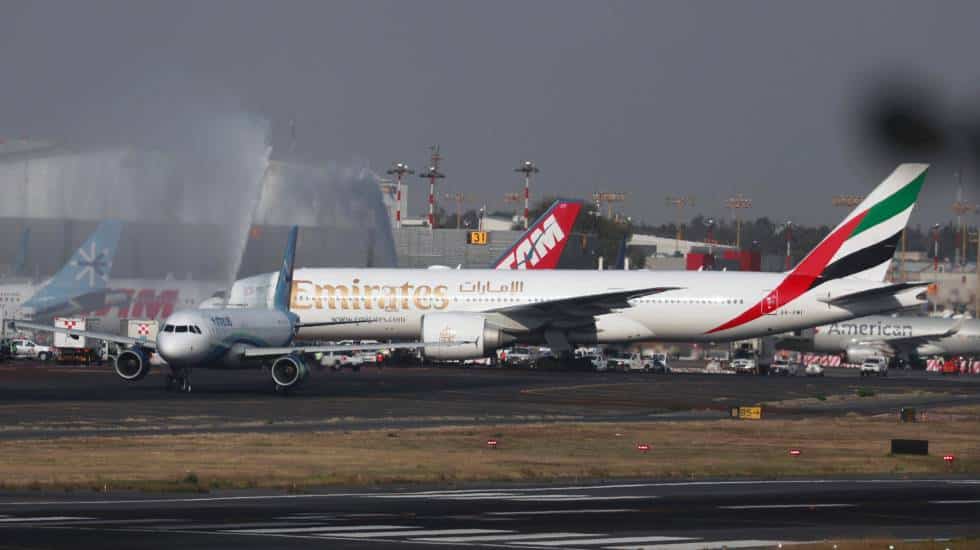 El primer vuelo de Emirates Airlines a tierras mexicanas llegó la tarde de ayer al Aeropuerto Internacional de la Ciudad de México (AICM).