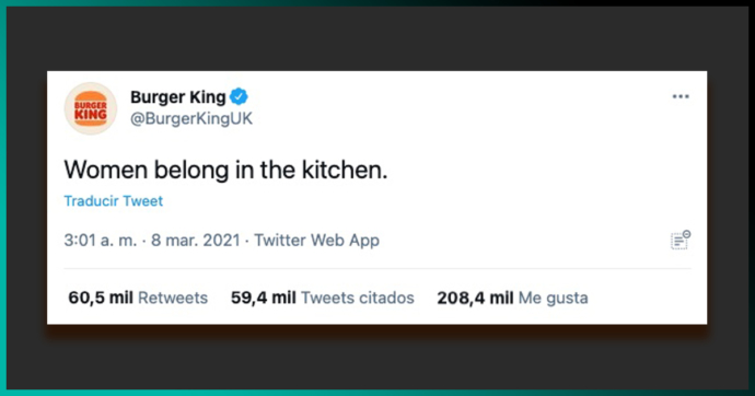 Sea como sea, el #8M tiene grandes implicaciones en la vida de la mujer contemporánea. Es por ello que la audiencia enfureció cuando Burger King en Reino Unido tuiteó que "El lugar de las mujeres es en la cocina".