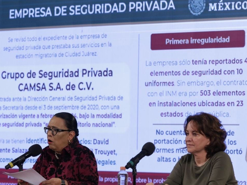 Debido a que es investigada por su presunta responsabilidad en el incendio de la estación migratoria de Ciudad Juárez, la Secretaría de Seguridad y Protección Ciudadana dijo que se le revocaría todos los contratos vigentes; sin embargo, no se explicó qué instancia asumiría la seguridad de los centros migratorios en 23 entidades.