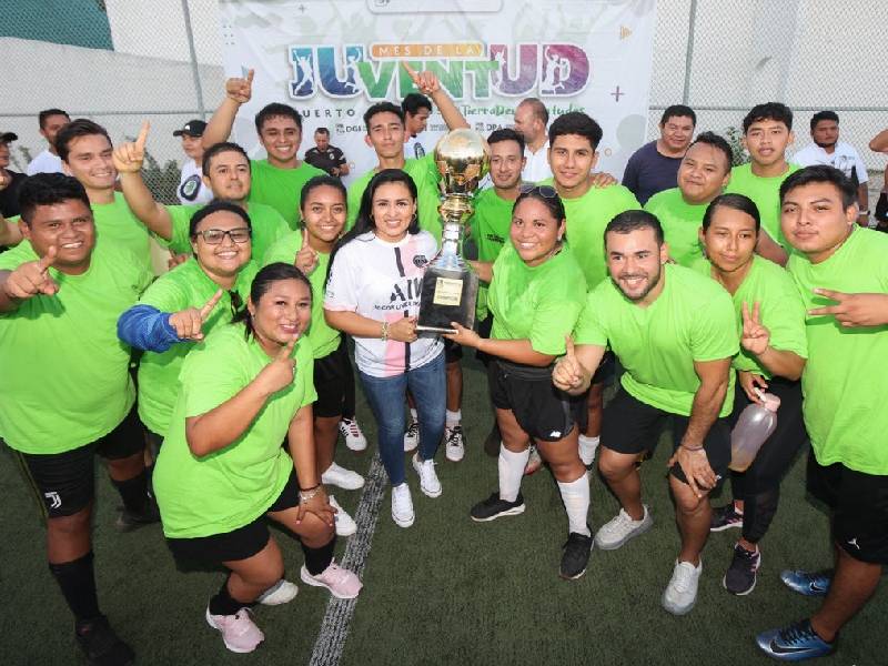 La presidenta municipal Blanca Merari Tziu Muñoz entregó el trofeo al equipo de Oficialía Mayor, ganador del Torneo Relámpago de Fútbol Interdependencias, que se organizó con motivo del Día Internacional de la Juventud, que enfrentó al equipo de Tesorería en la gran final.