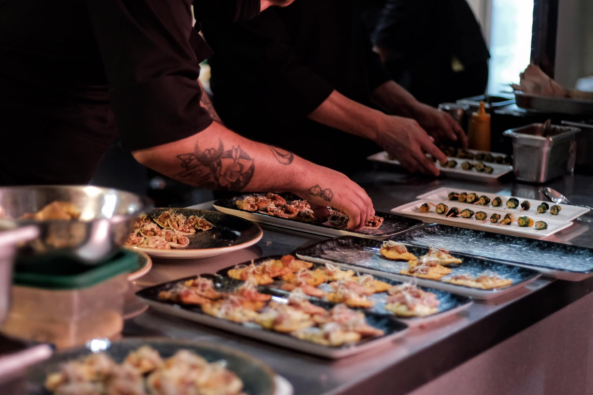 La oferta gastronómica es variada, incluyendo opciones vegetarianas, tacos veganos, hamburguesas, comida italiana y japonesa.