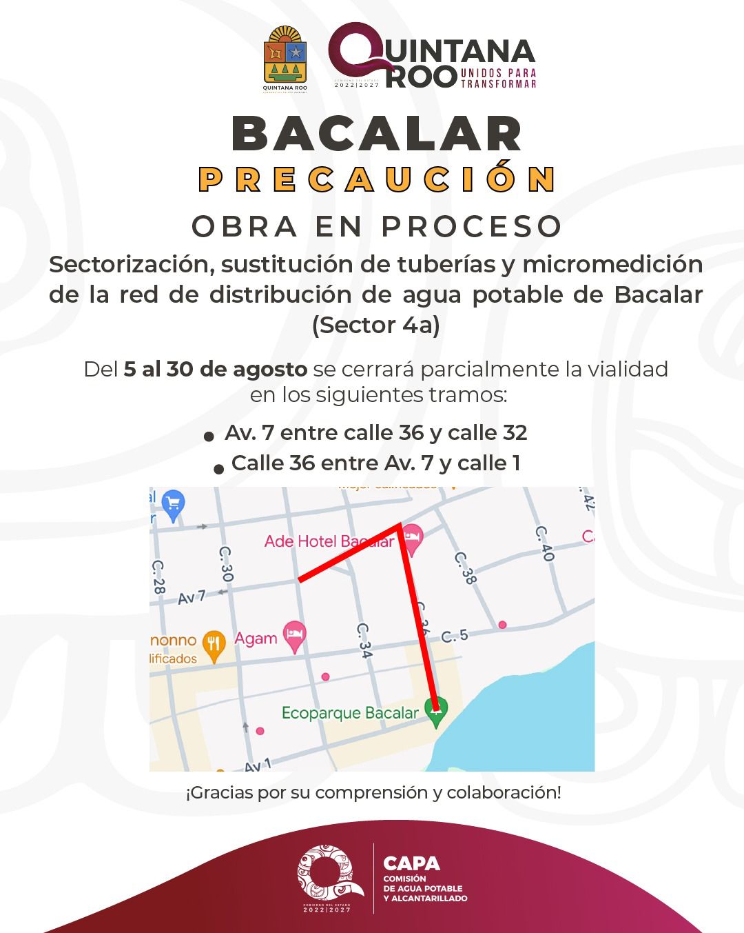 La Comisión de Agua Potable y Alcantarillado (CAPA) ha anunciado el inicio de la obra de Sectorización, sustitución de tuberías y micromedición de la red de distribución de agua potable en la ciudad de Bacalar. Esta tercera etapa del proyecto comenzará el lunes 5 de agosto y beneficiará a 1,758 habitantes de la cabecera municipal.