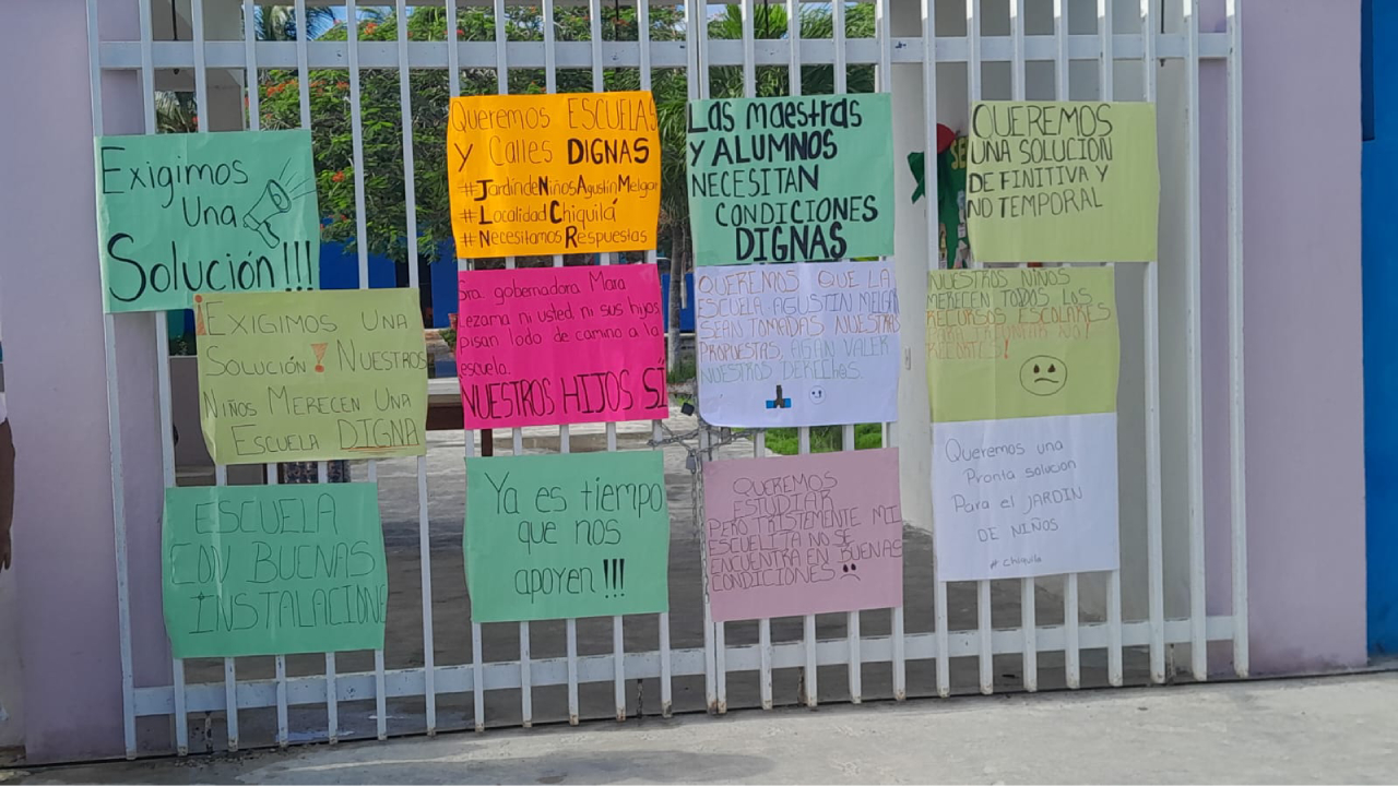 Padres de familia del jardín de niños “Agustín E. Melgar” realizaron una protesta frente al plantel en el puerto de Chiquilá.