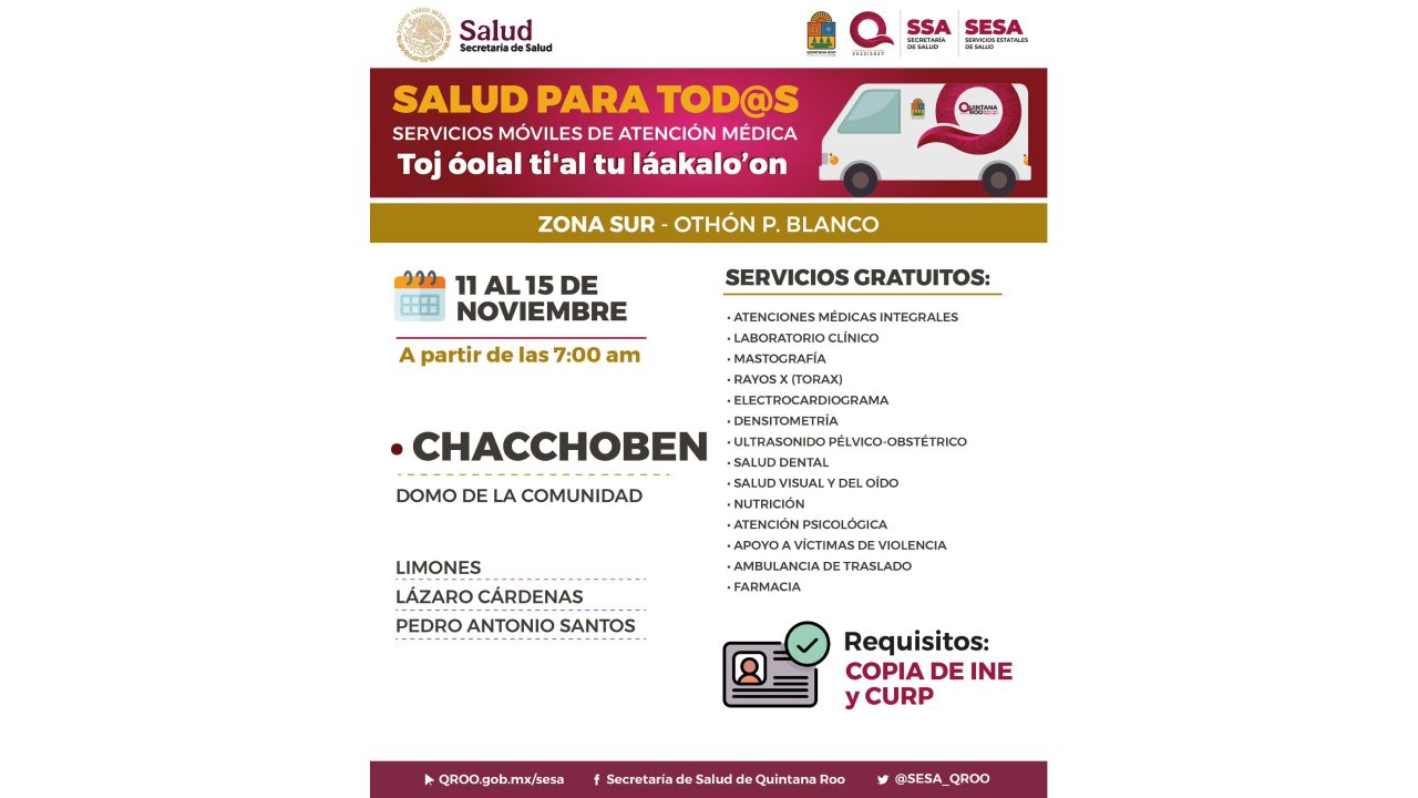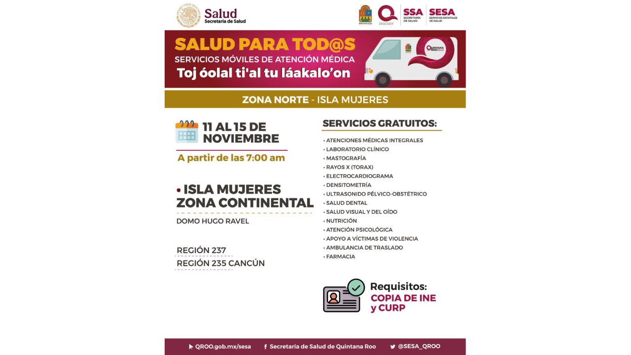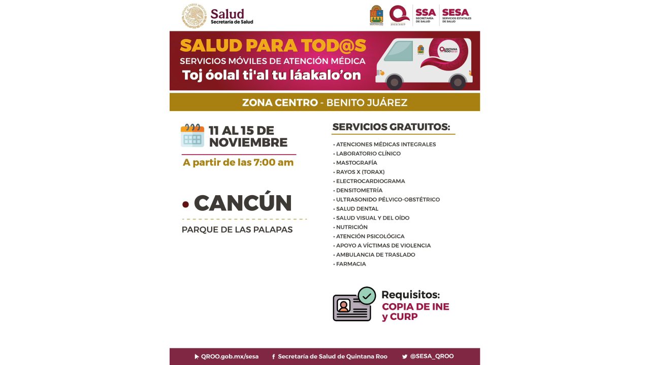 “Amig@s, las caravanas móviles Salud para Tod@s estarán del 11 al 15 de noviembre, ofreciendo servicios médicos gratuitos en el Parque de las Palapas en Cancún, Chacchoben e Isla Mujeres Zona Continental”, informó en sus redes sociales.