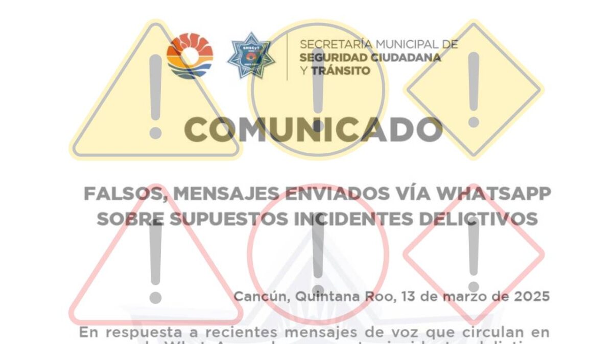 La Secretaría Municipal de Seguridad Ciudadana y Tránsito de Benito Juárez (SMSCyT) ha detectado la circulación de mensajes de voz en WhatsApp que alertan sobre supuestos hechos delictivos en Cancún.