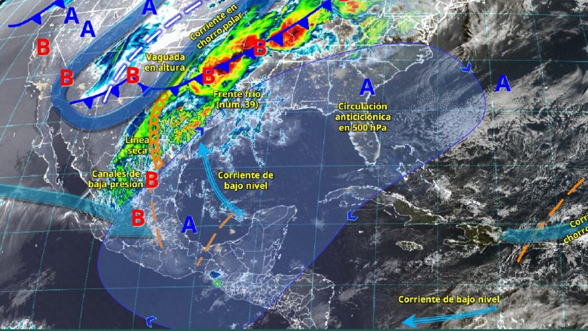 Canales de baja presión interactúan con el ingreso de humedad del océano Pacífico, el golfo de México y el mar Caribe, lo que provocará lluvias e intervalos de chubascos con posibles descargas eléctricas.