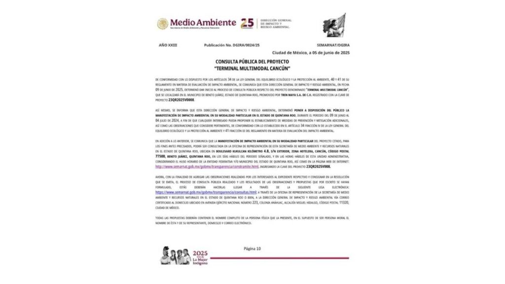 El megaproyecto del Tren Maya en Cancún avanza con una nueva etapa. A partir del 9 de junio, la Secretaría de Medio Ambiente y Recursos Naturales (Semarnat) abrió la consulta pública para la Terminal Multimodal Cancún, con un costo estimado de 7 mil 777 millones de pesos.