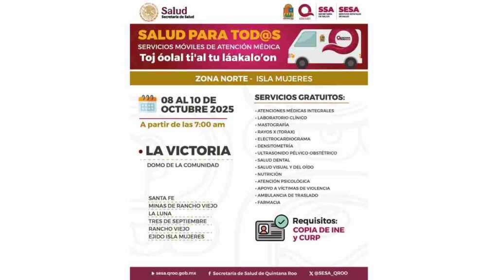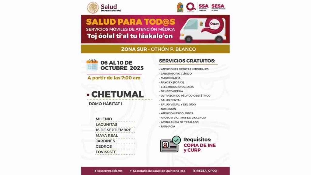 Asimismo, la gobernadora de Quintana Roo, Mara Lezama Espinosa, reitera la invitación a la ciudadanía para que acuda y aproveche esta oportunidad, ya que todos los servicios son completamente gratuitos.