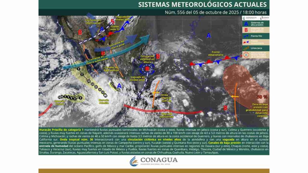 Asimismo, la Coordinación Estatal de Protección Civil Quintana Roo (Coeproc) informa que se mantiene el desplazamiento de la onda tropical número Treinta y seis sobre el sureste del país.