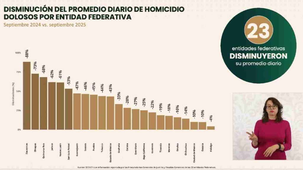 Asimismo, Marcela Figueroa, secretaria Ejecutiva del Sistema Nacional de Seguridad Pública, reveló que los primeros tres estados del país con la mayor reducción de homicidios dolosos son: Zacatecas, Chiapas y Quintana Roo.