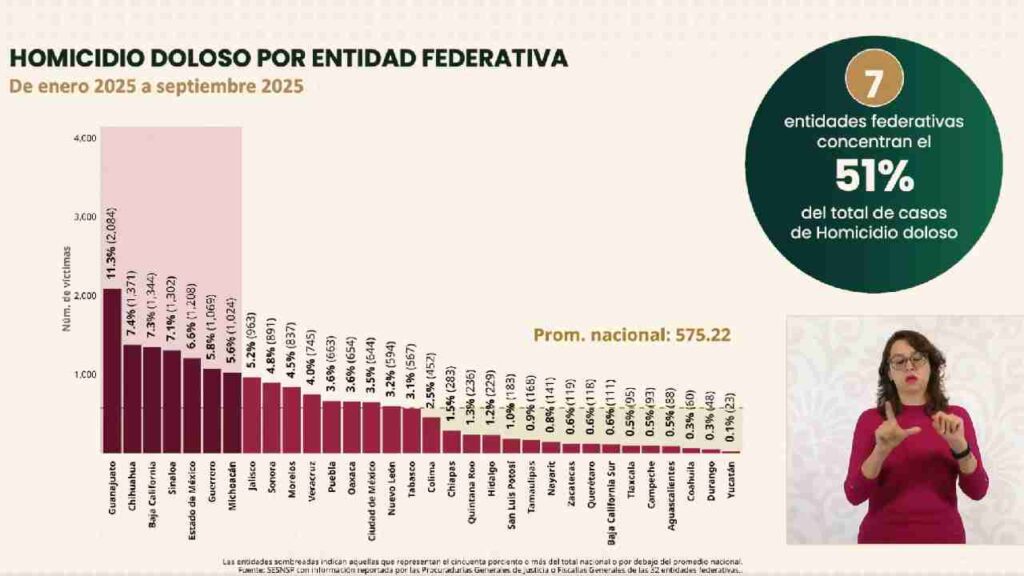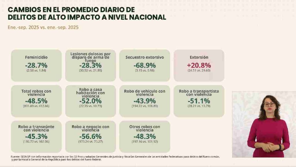 Según el reporte de la Secretaría Ejecutiva del Sistema Nacional de Seguridad Pública, el promedio diario de delitos ha disminuido un 46% desde 2018, incluyendo feminicidios, robos con violencia, robo a transportistas y lesiones dolosas.