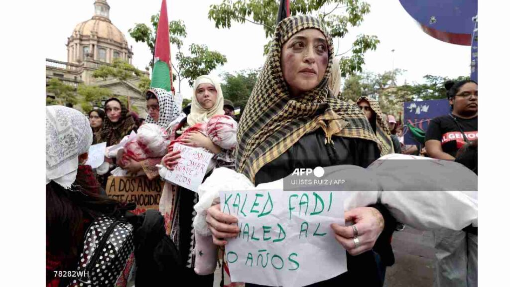 Mujeres interpretan una pieza sobre los niños asesinados en Gaza durante una manifestación para exigir el fin de los ataques a la Franja de Gaza y los territorios palestinos, como parte de una protesta nacional en Guadalajara, México.
