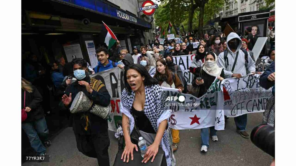 Estudiantes pro palestinos marchan tras pancartas durante una marcha interuniversitaria por Gaza en Londres, en el segundo aniversario del mortífero ataque liderado por Hamás contra Israel, que desencadenó una ofensiva de represalia en Gaza.