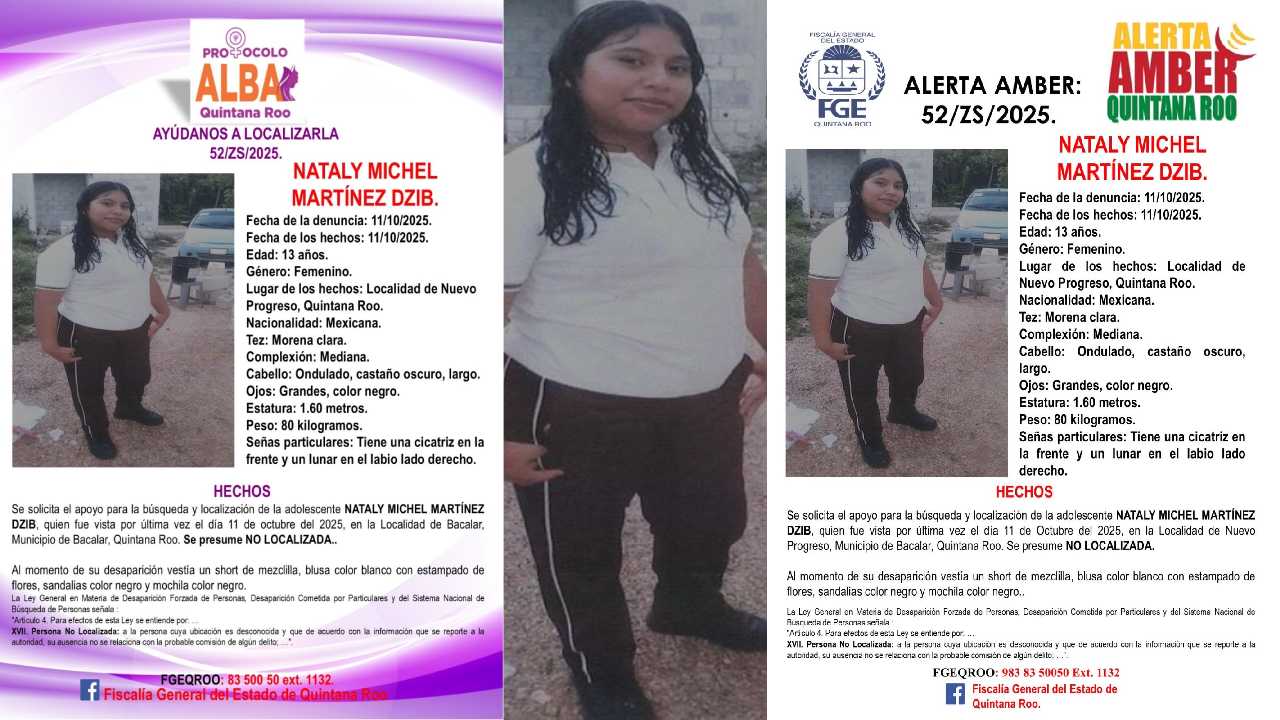La Fiscalía General del Estado de Quintana Roo (FGE) activó fichas de búsqueda para localizar a Nataly Michel Martínez Dzib, menor de edad vista por última vez el 11 de octubre de 2025 en la localidad de Nuevo Progreso, Bacalar.