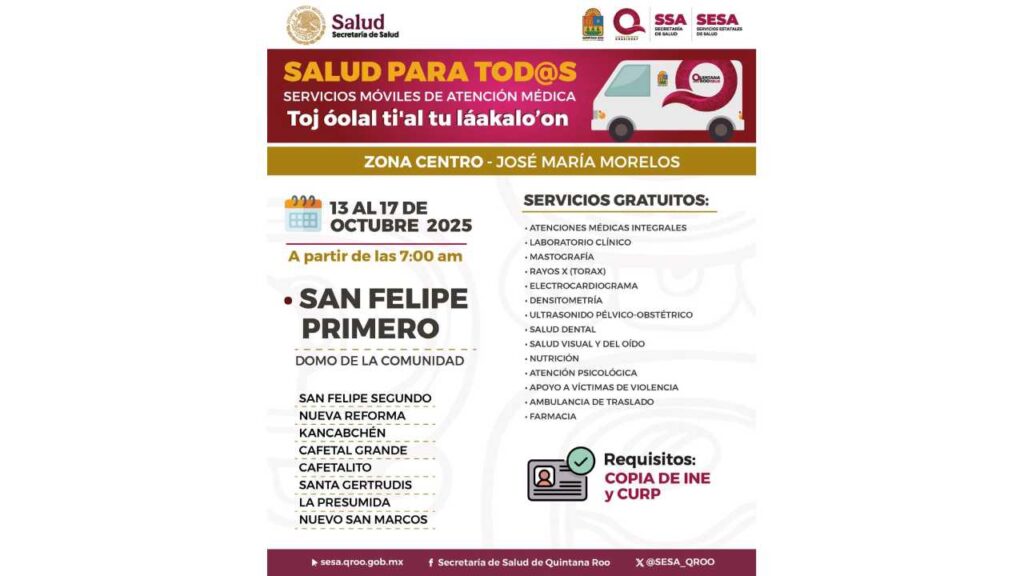 Las caravanas de salud inician este lunes 13 de octubre un nuevo recorrido por todos los rincones de Quintana Roo, llevando servicios gratuitos a toda la población para una vida mejor y plena.