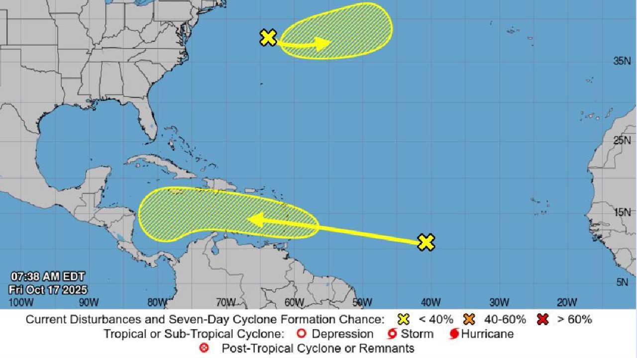 1️⃣ Una onda tropical en el océano Atlántico Central mantiene 🟨 10 % de probabilidad para desarrollo ciclónico en 48 horas y 30% en 7 días.