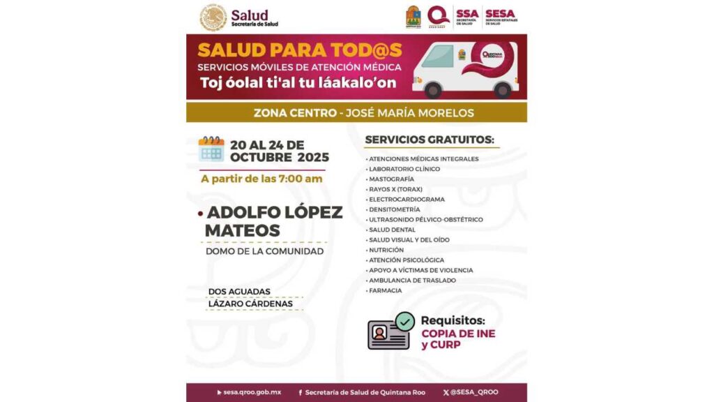 A partir de hoy, lunes 20 y hasta el próximo viernes 24 de octubre, las Caravanas de Salud “Salud para Tod@s” estarán visitando comunidades de los municipios de Tulum, Bacalar y José María Morelos, ofreciendo servicios médicos totalmente gratuitos para toda la población.