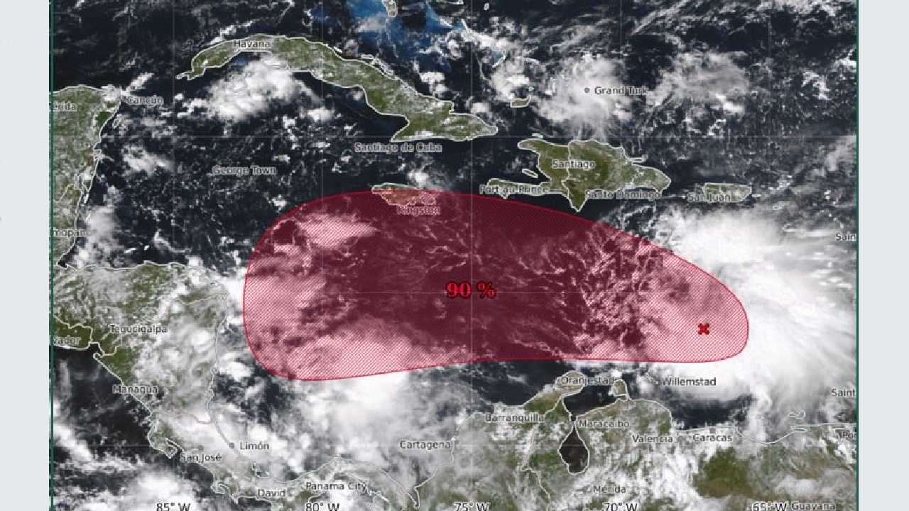 El potencial ciclón que se localiza en el mar Caribe oriental mantiene una probabilidad ahora del 90% de desarrollo durante los próximos siete días, según informó el Centro Nacional de Huracanes (NHC).