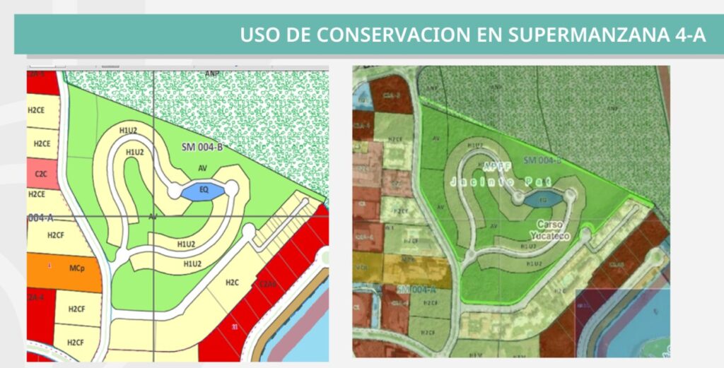 En tanto, la zona Jacinto Pat, ubicada entre el bulevar Kukulcán y la Laguna Nichupté, fue declarada Área de Protección de Flora y Fauna el 15 de agosto de 2023, debido a su biodiversidad con 333 especies, de las cuales 42 están en riesgo. Sin embargo, los PDU 2018 y 2022 le asignan tres usos distintos: habitacional, equipamiento y área verde, lo que contraviene su decreto de protección.