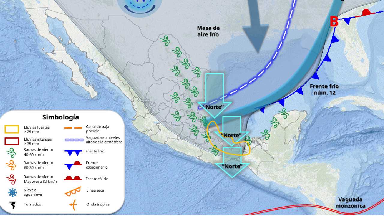 También destaca la Coeproc que el frente frío número 12 se localiza sobre el norte y noreste del país, comenzará a recorrer la vertiente del golfo de México, origina viento fresco y arrachado del norte, lluvias y descenso de la temperatura sobre su área de influencia.