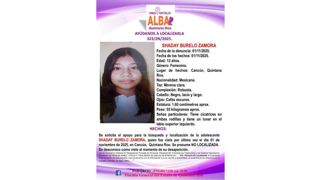 - Shaday Burelo Zamora: de 12 años de edad, fue vista por última vez el 1 de noviembre de 2025, Benito Juárez, Quintana Roo.