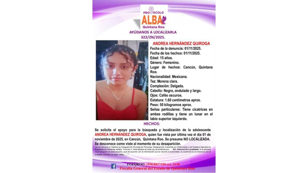 - Andrea Hernández Quiroga: última vez vista el 1 de noviembre de 2025, Benito Juárez, Quintana Roo. Tiene 15 años de edad.