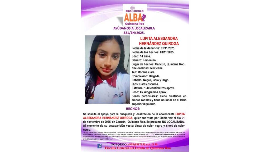 - Lupita Alessandra Hernández Quiroga, de 14 años de edad: desaparecida el 1 de noviembre de 2025, Benito Juárez, Quintana Roo.