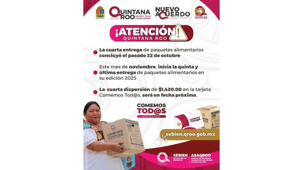 ¡Mucha atención! El Gobierno de Quintana Roo anunció el inicio de la quinta y última entrega de paquetes alimentarios del programa Comemos Tod@s, una estrategia social que busca fortalecer la seguridad alimentaria de las familias más vulnerables del estado.