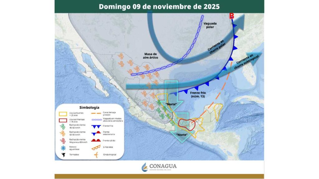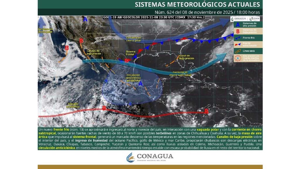 Asimismo señala que el frente frío número 13 se desplazará rápidamente sobre el norte, noreste y vertiente oriental del país, originando viento fresco y arrachado del norte, lluvias acompañadas de actividad eléctrica y descenso de la temperatura sobre su área de influencia.