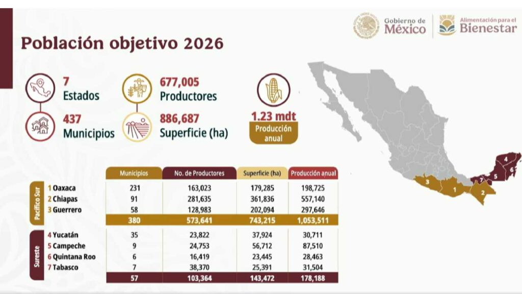 Asimismo, y de acuerdo con María Luisa Albores, titular de Alimentación para el Bienestar, el programa beneficiará a 677 mil familias productoras en 437 municipios de siete estados, con una superficie de 886 mil hectáreas destinadas al cultivo de maíz.