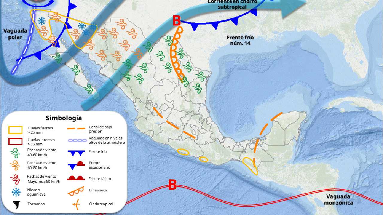 Asimismo destaca que el frente frío número 15 se desplazará sobre el noroeste del país, originará viento arrachado del norte, lluvias fuertes y descenso de la temperatura sobre su área de influencia.