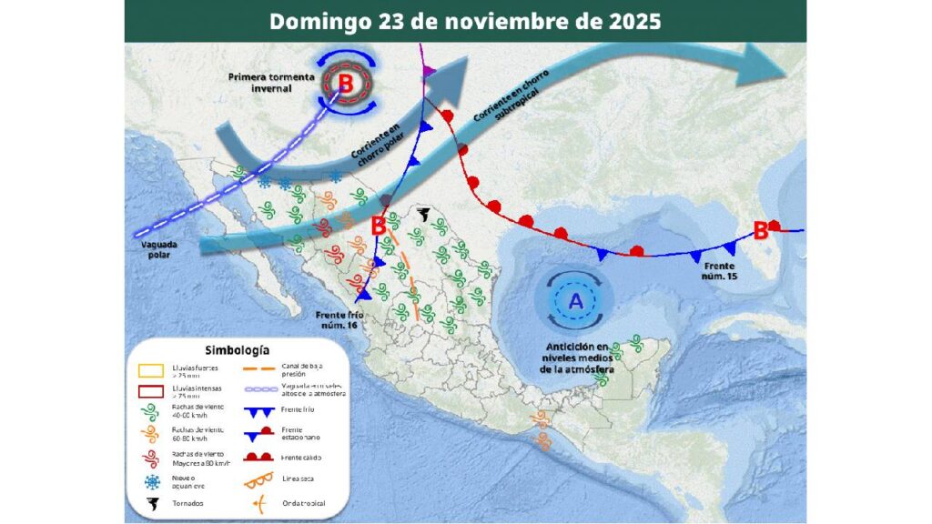 Este sábado, la primera tormenta invernal de la temporada y el frente frío número 16 avanzan sobre el noroeste de México, generando un marcado descenso de temperaturas, vientos muy fuertes y lluvias de fuertes a muy fuertes en Baja California y Sonora. El Servicio Meteorológico Nacional (SMN) advirtió también la posible caída de nieve o aguanieve en zonas serranas de ambas entidades.