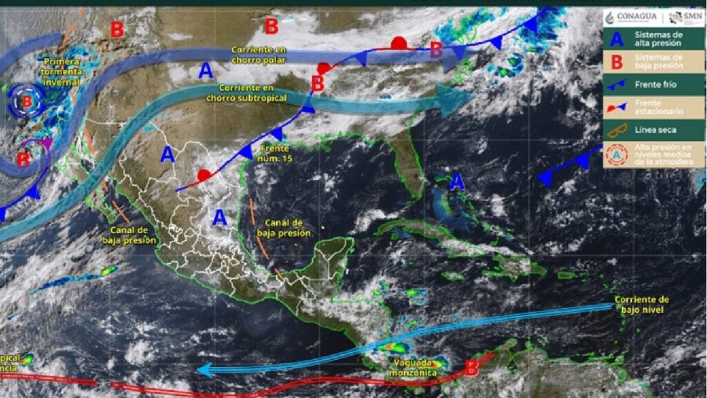 Mientras tanto, el frente frío número 15 continúa ocasionando vientos fuertes, chubascos y lluvias en el norte y noreste del país. A su vez, un canal de baja presión combinado con el ingreso de humedad del Pacífico, Golfo de México y mar Caribe, generará lluvias y chubascos dispersos en el occidente, centro, sur, oriente y sureste del territorio nacional, incluida la Península de Yucatán.