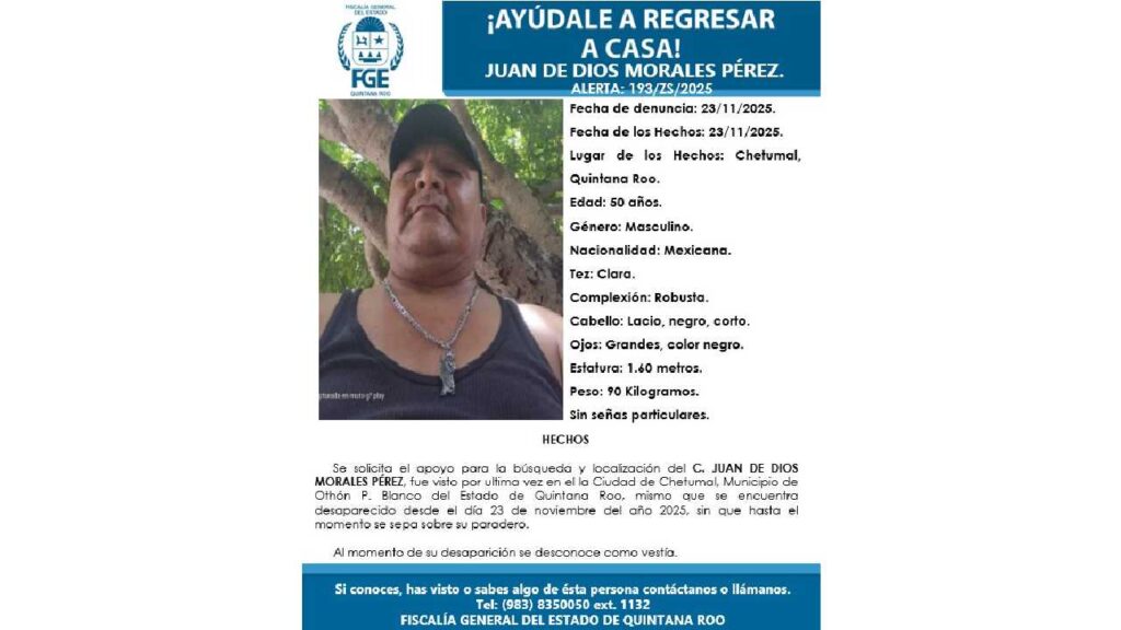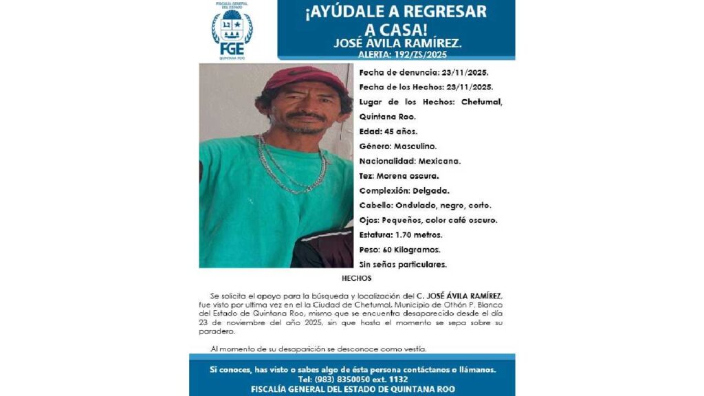 La Fiscalía reiteró el llamado a la ciudadanía para aportar información que ayude a localizar a José Ávila Ramírez, Juan de Dios Morales Pérez, Silvano Morales y Guadalupe Ramírez, mediante el número 983 835 0050 ext. 1132.