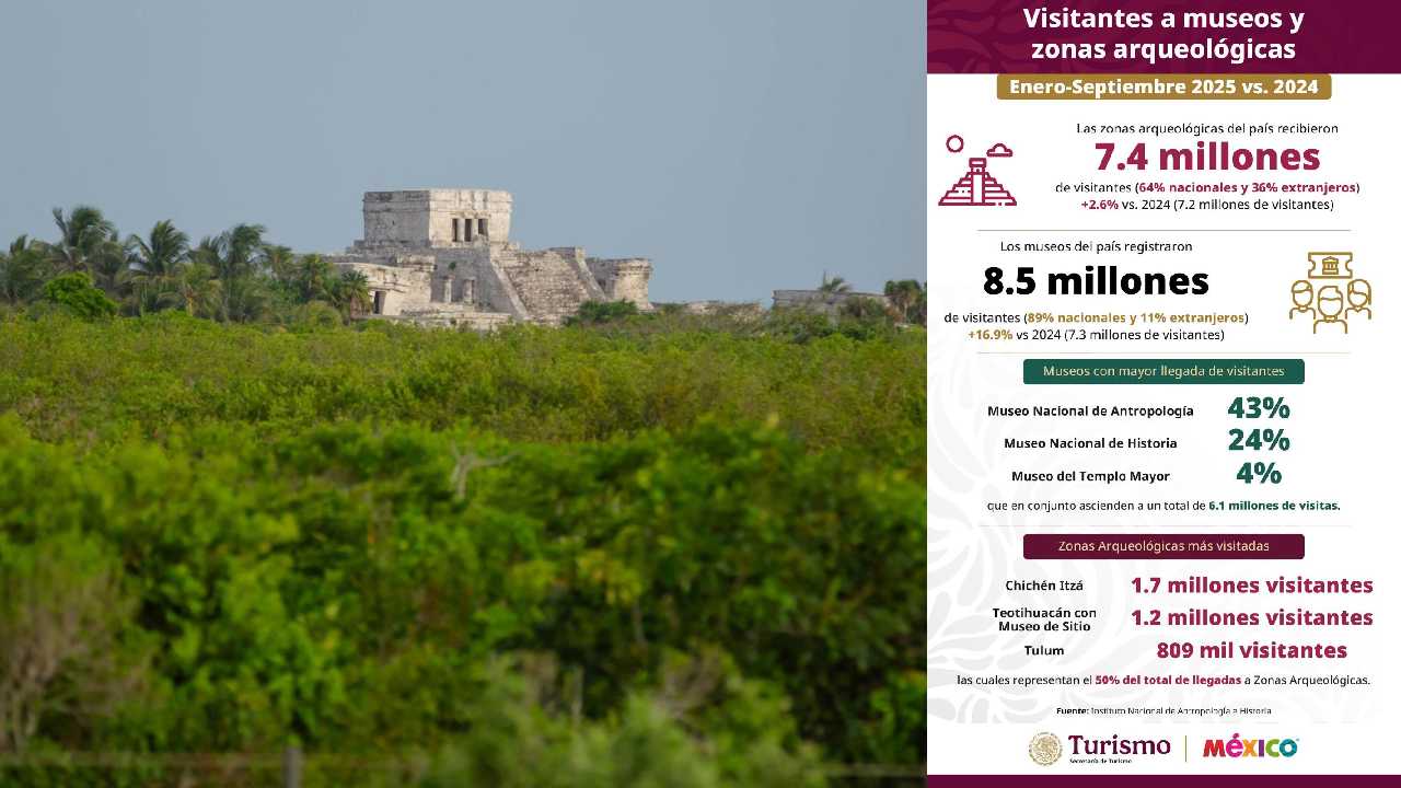 Entre enero y septiembre de 2025, las zonas arqueológicas recibieron 7.4 millones de visitantes, 64% nacionales y 36% extranjeros, lo que representa un incremento de 2.6% respecto al mismo periodo de 2024.