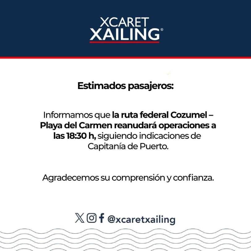 La naviera Xcaret Xailing confirmó que la ruta federal Cozumel–Playa del Carmen fue suspendida de 16:00 a 18:00 horas, siguiendo instrucciones de Capitanía de Puerto. La compañía reiteró que la seguridad de los pasajeros es su prioridad e informó que actualizará cualquier cambio en sus plataformas oficiales.