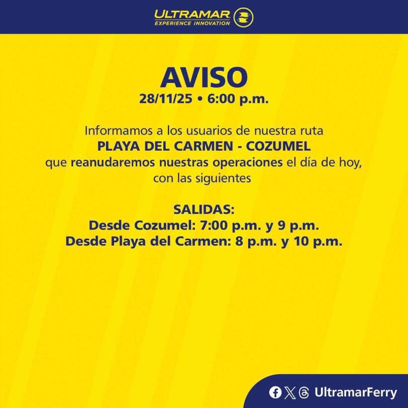 La empresa Ultramar informó que, a partir de las 16:00 horas de este viernes 28 de noviembre, todas las salidas de la ruta Playa del Carmen–Cozumel quedaron suspendidas. La naviera señaló que retomará operaciones únicamente cuando la Capitanía de Puerto confirme condiciones seguras de navegación.