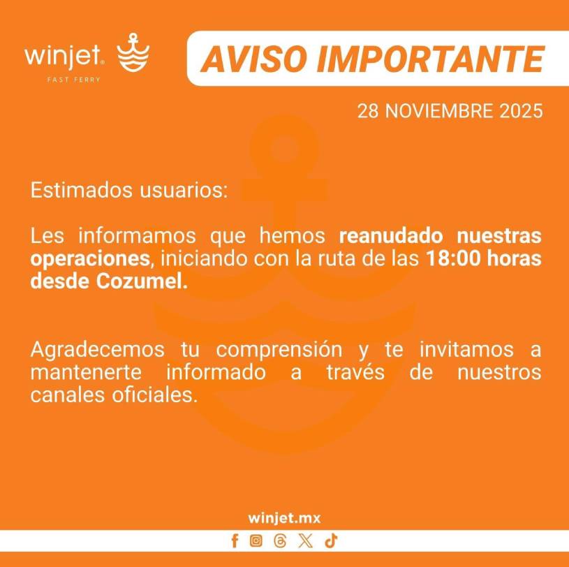 Por su parte, Winjet anunció que su última salida del día fue a las 17:00 horas desde Playa del Carmen. Después de ese horario, el servicio quedó detenido hasta recibir autorización de las autoridades portuarias. La empresa pidió a los usuarios mantenerse informados a través de sus canales oficiales.