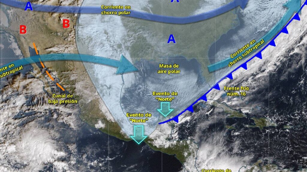 De acuerdo con el Servicio Meteorológico Nacional (SMN), el frente frío número 16 se extiende sobre el sureste del país, incluida la península de Yucatán. La masa de aire polar asociada genera un evento de “Norte” con rachas de hasta 60 km/h en Campeche, Yucatán y Quintana Roo.
