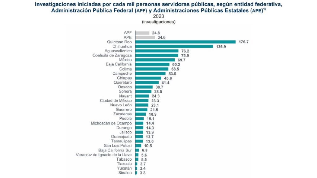 En el ámbito estatal, la entidad registró un promedio de 34.6 investigaciones por cada mil servidores públicos. Chihuahua y Quintana Roo encabezaron la lista en administraciones estatales, ambas con más de 130 expedientes iniciados por cada mil adscritos, mientras que al menos seis estados reportaron menos de diez.