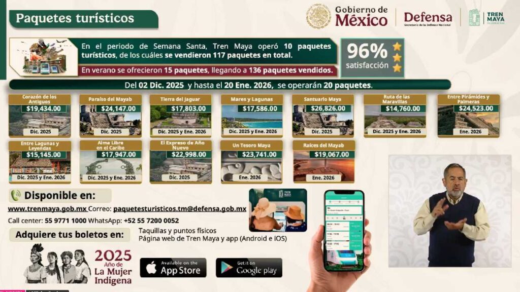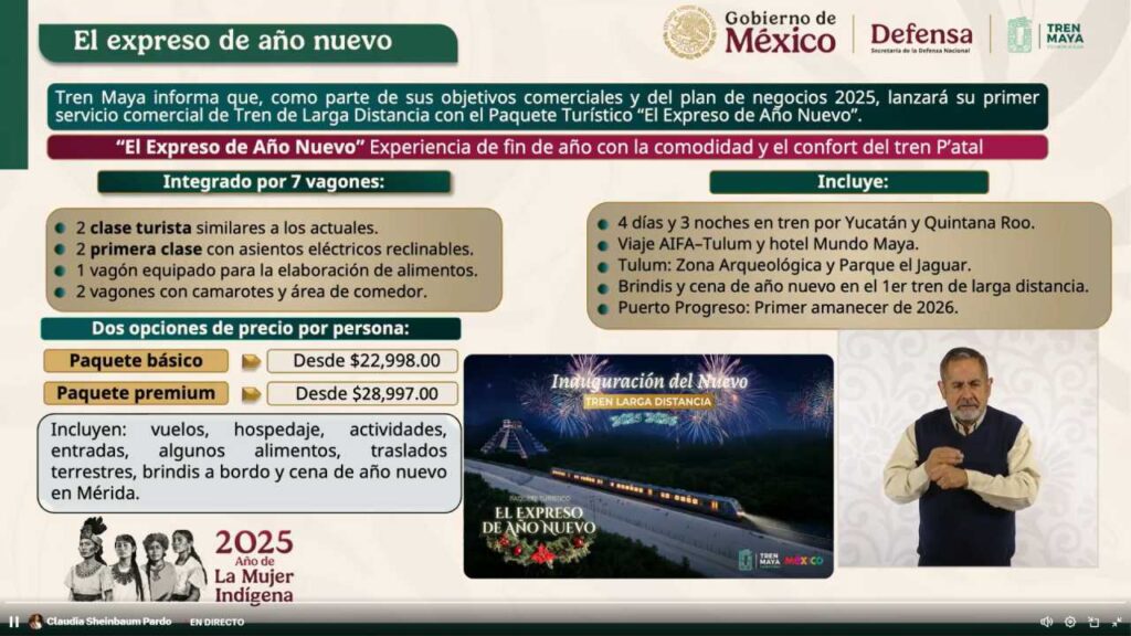 Durante la Mañanera del Pueblo, y ante la presidenta Claudia Sheinbaum Pardo, el director general del Tren Maya, general Óscar David Lozano Águila, detalló los paquetes disponibles para los viajeros.