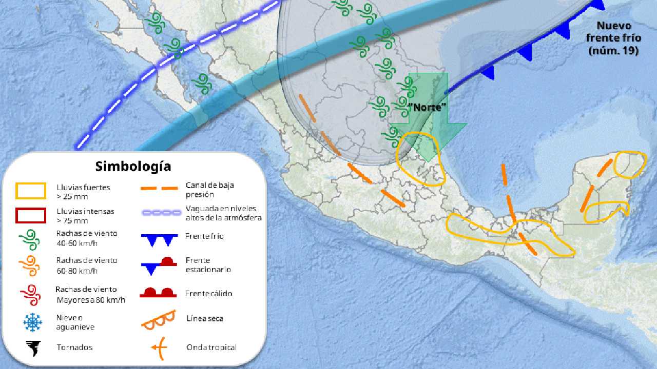 Destaca que un nuevo frente frío (número 19) se desplazará sobre el norte y noreste del país, originará viento fresco y arrachado del norte, lluvias y descenso de la temperatura sobre su área de influencia.