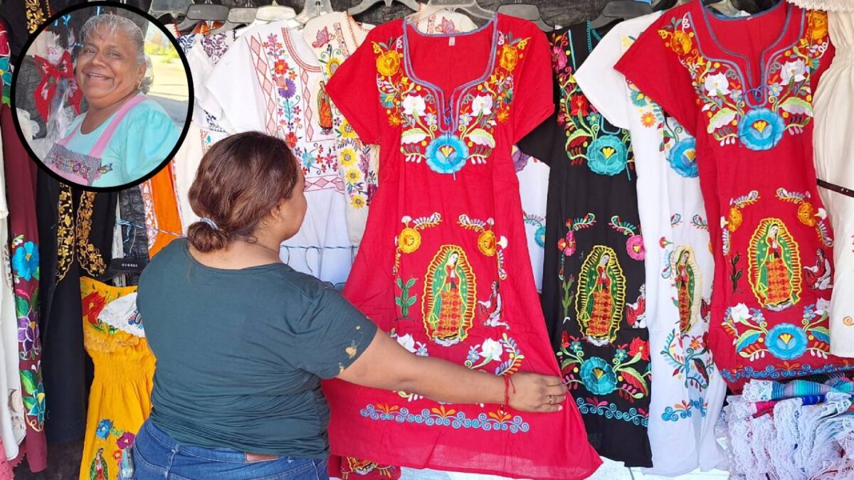 Su destino es siempre el mismo: el Santuario de Nuestra Señora de Guadalupe, en la zona centro de Cancún, donde instala su pequeño puesto para acompañar —con colores, tela e identidad— el fervor guadalupano que envuelve la ciudad del 3 al 12 de diciembre.
