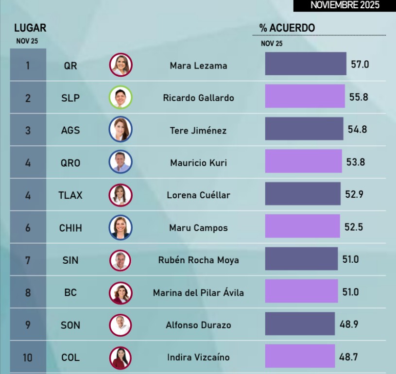 En mayo de 2025 descendió al tercer sitio con 52.8 por ciento, para retomar el primer lugar en junio y julio. En agosto se ubicó en la segunda posición y, finalmente, de septiembre a noviembre, volvió a liderar la medición con niveles superiores al 57 por ciento.