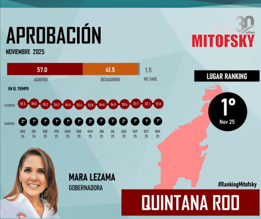 La gobernadora de Quintana Roo, Mara Lezama Espinosa, se consolidó como la mandataria estatal mejor evaluada del país, de acuerdo con la encuesta Mitofsky de gobernadores correspondiente a noviembre, al registrar el mayor nivel de aprobación ciudadana a nivel nacional.