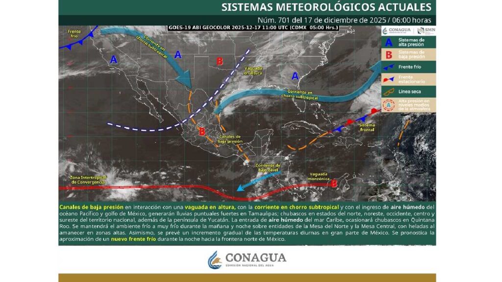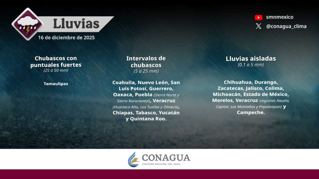 Asimismo, dicho sistema originará en el estado de Quintana Roo cielo medio nublado con incremento de nublados durante el transcurso del día, y lluvias con intervalos de chubascos (acumulados de 5 a 25 mm).