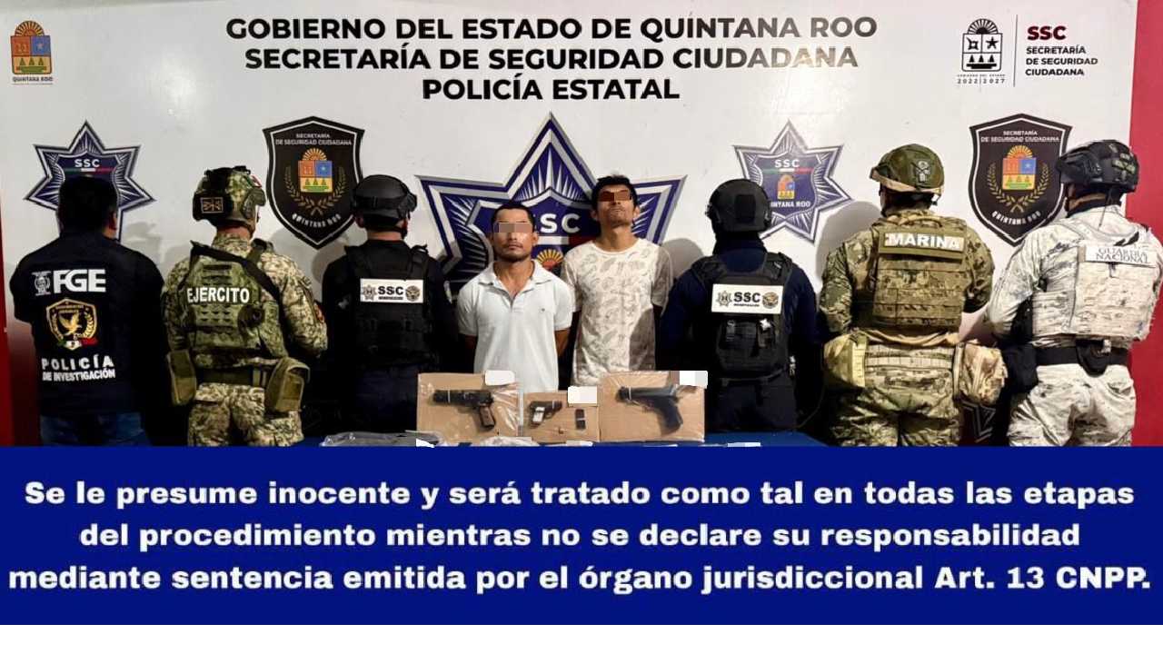 Los detenidos fueron identificados como Hugo Rafael “N” y Esban Haziel “N”, quienes presuntamente están implicados en delitos contra la salud y portación de arma de fuego. En el operativo participaron de manera coordinada elementos de la Secretaría de Marina, Secretaría de la Defensa Nacional, Guardia Nacional y la Fiscalía General del Estado de Quintana Roo, como parte de las acciones para reforzar la seguridad en zonas prioritarias.